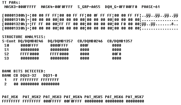 The Simplified Bank Bits Detected TableThe Bank Bits Detected table which follows the Structure Analysis shows you how the structure data is combined to determine the module full structure. In the example, we see a module with 72 bits in Bank 1. in the next example we see a 72-bit module with two banks: Notice in the next example that the 1 bank 72-bit module has its parity bits divided as "00C3" in S0, CB/DQMB0246 and "003C" in S0, CB/DQMB1357, while the preivious module shows either "000F" and "00F0". The first example above showed "00FF" and "0000". All of these x72 modules are identified as different type in the RAMCHECK's Test Log.