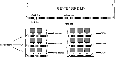 The best way to determine the type and voltage of your DIMM is to inspect the two key positions on the module. The keys are small tabs which correspond to specific lock keys in the motherboard sockets. The socket keys prohibit the insertion of wrong type DIMM modules in a given socket.